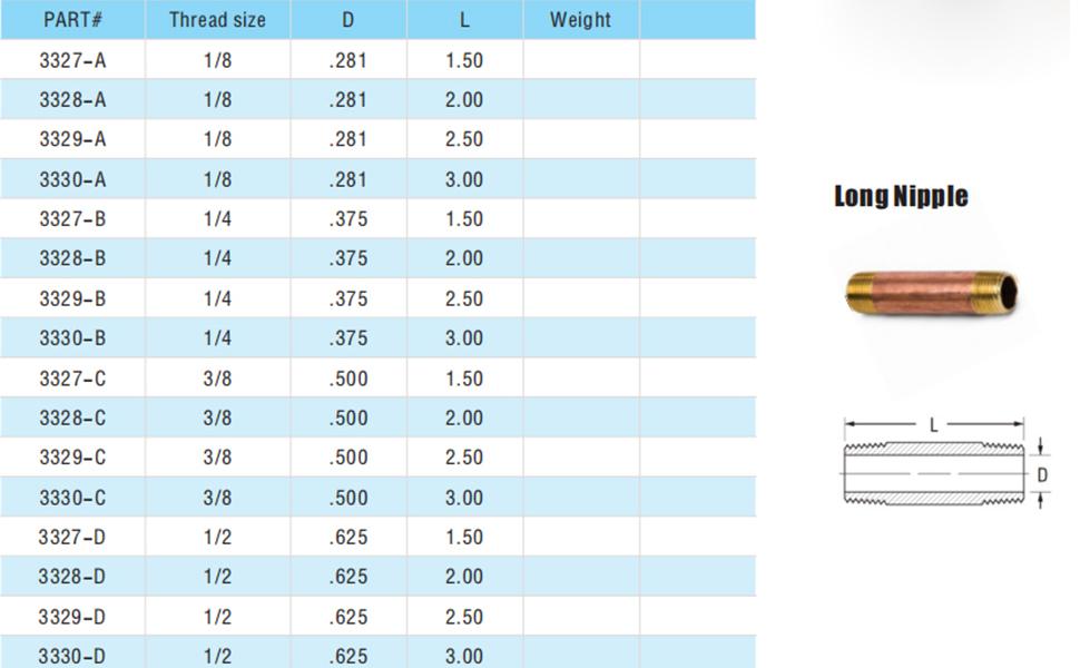 The long nipple is a pipe fitting with 1/4" male National Pipe Taper (NPT) threads on both ends for connecting and extending two pieces of female pipe.The long nipple is a longer version than the short, and is threaded on both ends with an expanse of plain unthreaded surface in the middle. It has male NPT threads for creating tighter seals than straight threads and is made from brass, which is more economical, and offers greater corrosion resistance than steel. Pipe fittings are components used for connecting, terminating, controlling flow, and changing the direction of piping in many different industries. When purchasing pipe fittings, consider the application, as this will affect material type, shape, size and required durability. Fittings are available threaded or unthreaded, in many shapes, styles, sizes, and schedules (pipe wall thickness). Specification: -Maximum working pressure: Operating pressure UP to 1200psi -Item Shape: Nipple -Material: Brass -Measurement System :Inch -System: Threaded