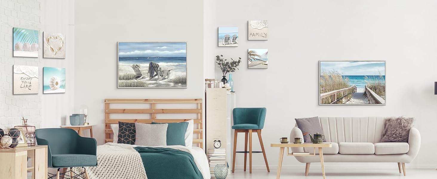 Abstract Beach Canvas Artwork Framed Sand Chair Wall Art Seascape | Desertcart New Zealand