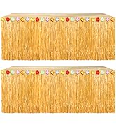 The Fovths 2 Pack Luau Grass Table Skirt set features two 9-foot by 29.5-inch synthetic grass skirts in straw yellow, crafted from durable, waterproof polyester. Designed for easy installation with included adhesive tapes, these reusable skirts fit various table shapes, perfect for Hawaiian, beach, and summer-themed parties. Vacuum-sealed for freshness, they deliver vibrant tropical flair with minimal effort.