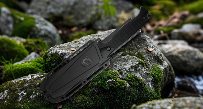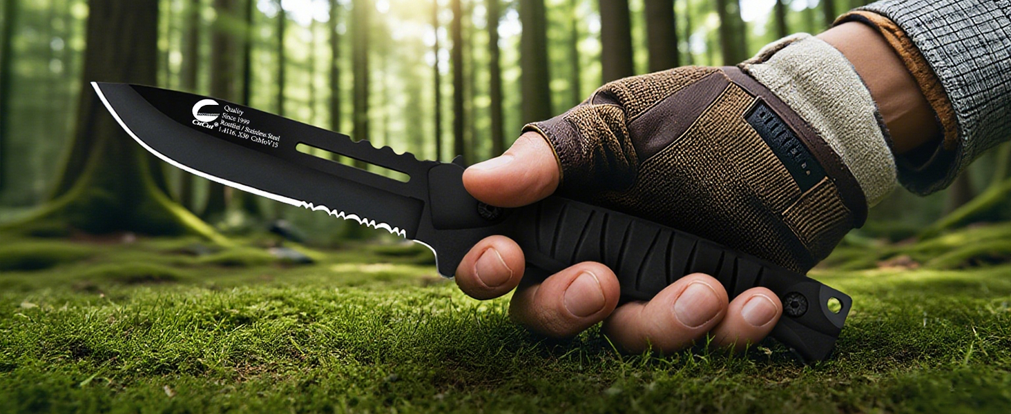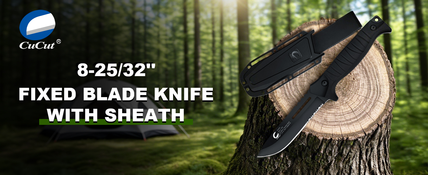 The CuCut Full Tang Fixed Blade Knife features a robust 4-inch carbon steel blade with a black non-stick finish and serrated edge, housed in a secure locking sheath. Its riveted polypropylene handle offers superior grip and durability, making it an essential tool for camping, hiking, survival, and outdoor adventures.