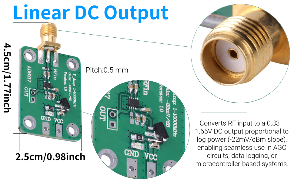 The Hilitand AD8317 Logarithmic Detector RF Power Meter is a compact, high-performance sensor designed for professional RF power measurement across an ultra-wide frequency range of 1 MHz to 10 GHz. Utilizing the advanced AD8317 chip, it accurately detects power levels from -55dBm to 0dBm and converts RF signals into a logarithmic DC voltage output with a dynamic range of 55dB. Ideal for applications in radio frequency detection, power measurement, environmental field strength monitoring, and automatic gain/level control, this lightweight 10g device offers reliable, precise, and versatile performance for engineers and tech professionals aiming to optimize RF systems.