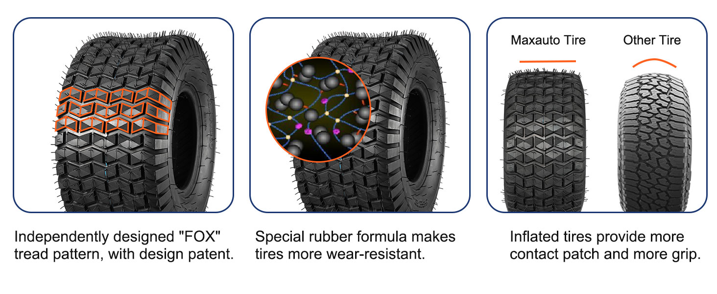 MaxAuto FOX V1 15x6.00-6 lawn mower tires feature a patented tread design for superior traction and lawn protection. These 4-ply tubeless tires support up to 570 lbs at 30 PSI, with a 6mm tread depth for durability. Compatible with most riding mowers, lawn tractors, and golf carts, this set of two tires offers a reliable, heavy-duty upgrade for enhanced performance and longevity.