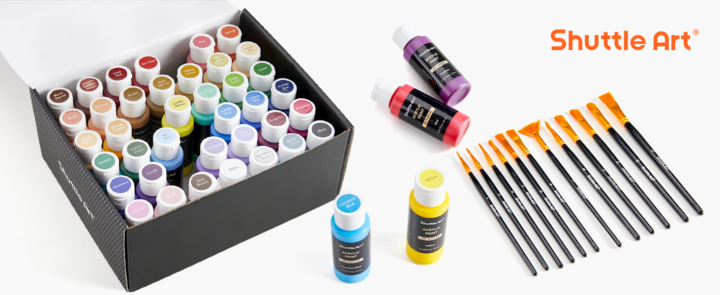 The Shuttle Art 42-color acrylic paint set offers 2oz bottles of premium, water-based, non-toxic paints with a glossy finish. Designed for durability and versatility, these waterproof, fade-resistant paints work on multiple surfaces including canvas, wood, ceramic, and glass. The set includes 12 brushes, making it ideal for artists of all skill levels seeking vibrant, long-lasting color.
