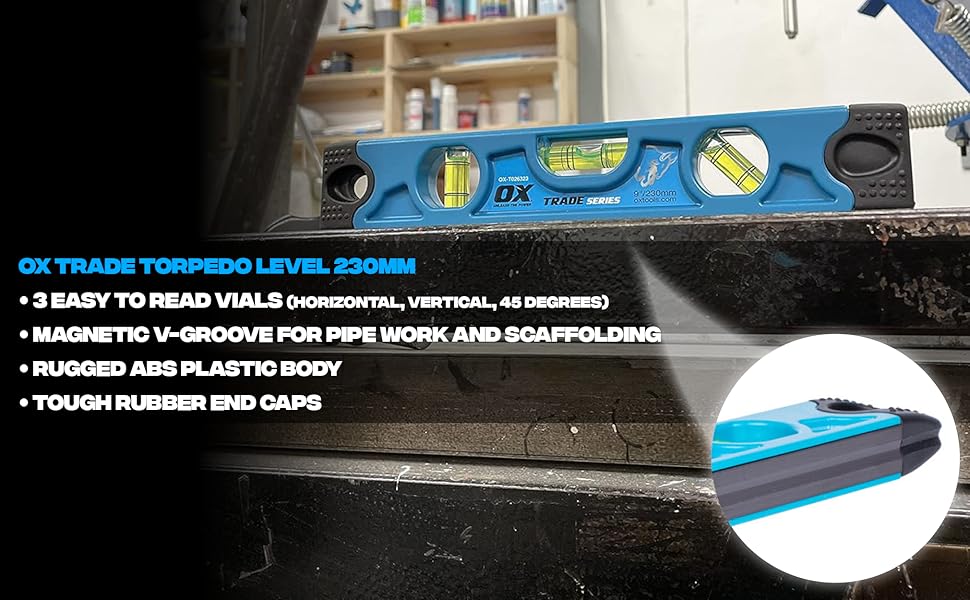 The OX Trade Torpedo Level 230mm is a lightweight, durable aluminium measuring tool designed for professionals who demand accuracy and portability. Its compact 230mm length and vibrant blue color make it an essential, easy-to-spot addition to any toolkit, delivering reliable bubble level measurements without the need for batteries.