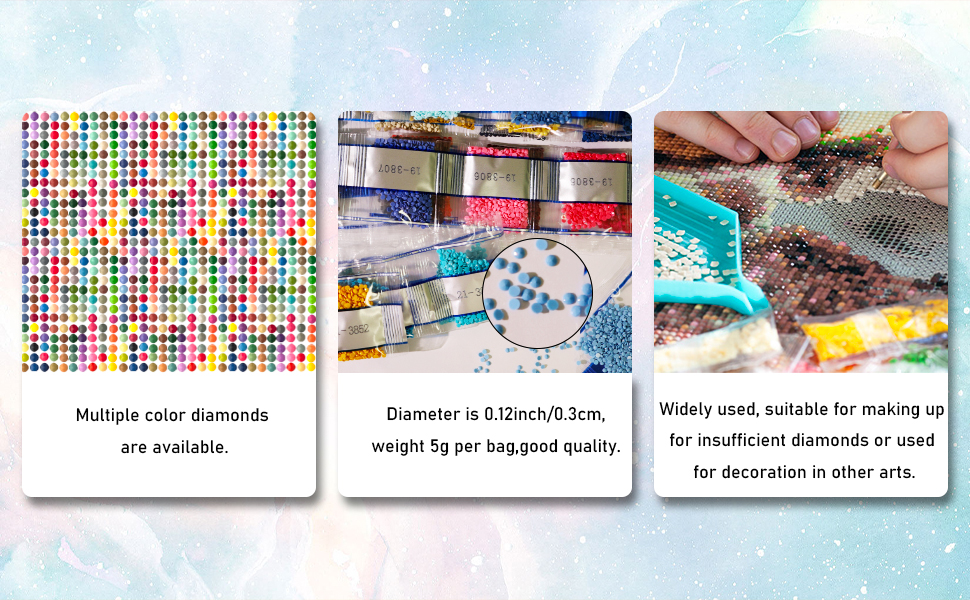 The diamond painting beads come nicely packaged in their individual sleeves AND the colors are in gradient order. So if you doing any kind of gradient work, this will make your life so much easier!The colors are vibrant and sparkle like you would expect!These are going to be a great addition to my "diamond" collection. . .lol I am very much looking forward to using these as the colors are AMAZINGLY bright!