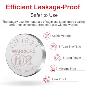 The Warriors5X 1632 CR1632 Coin Button Cell Batteries are high-quality, 3V lithium batteries designed for a variety of devices. With CE and ROHS certifications, these Grade A cells ensure long-lasting power and reliability. Each pack contains 5 batteries, compliant with child safety standards, and offers a shelf life of up to 3 years.