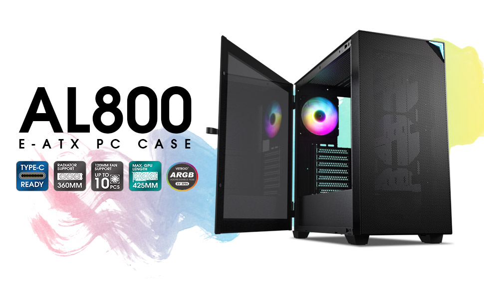 The VetrooAL800 Full Tower PC Case combines functionality and aesthetics with its innovative door opening design, tempered glass panels, and built-in ARGB LED strip. It supports E-ATX/ATX motherboards and 40 Series GPUs, ensuring your setup is both powerful and visually stunning. With a Type-C port for modern connectivity and a front mesh panel for superior airflow, this case is perfect for gamers and professionals alike.