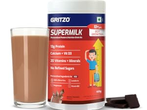 Gritzo SuperMilk Growth+ is a premium protein powder designed for children aged 2-6, delivering 7g of high-quality protein, 20 essential vitamins and minerals including 100% RDA Vitamin D3, and brain-boosting DHA. With zero refined sugar and a natural double chocolate flavor, it supports healthy growth, immunity, hydration, and cognitive development in a clean, vegetarian formula trusted by parents.