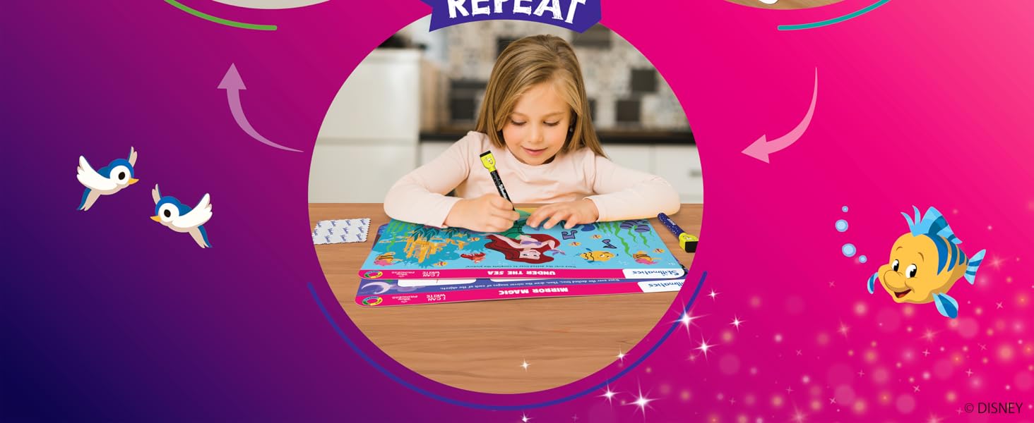 Skillmatics I Can Write Disney Princess is a reusable educational activity set featuring 12 double-sided mats with Disney Princess themes. Designed for children aged 3 to 6, it promotes writing, tracing, and early literacy skills through dry-erase markers and easy-clean mats. The set includes markers, a duster, and an achievement certificate, encouraging screen-free, skill-building play that combines creativity and focus.