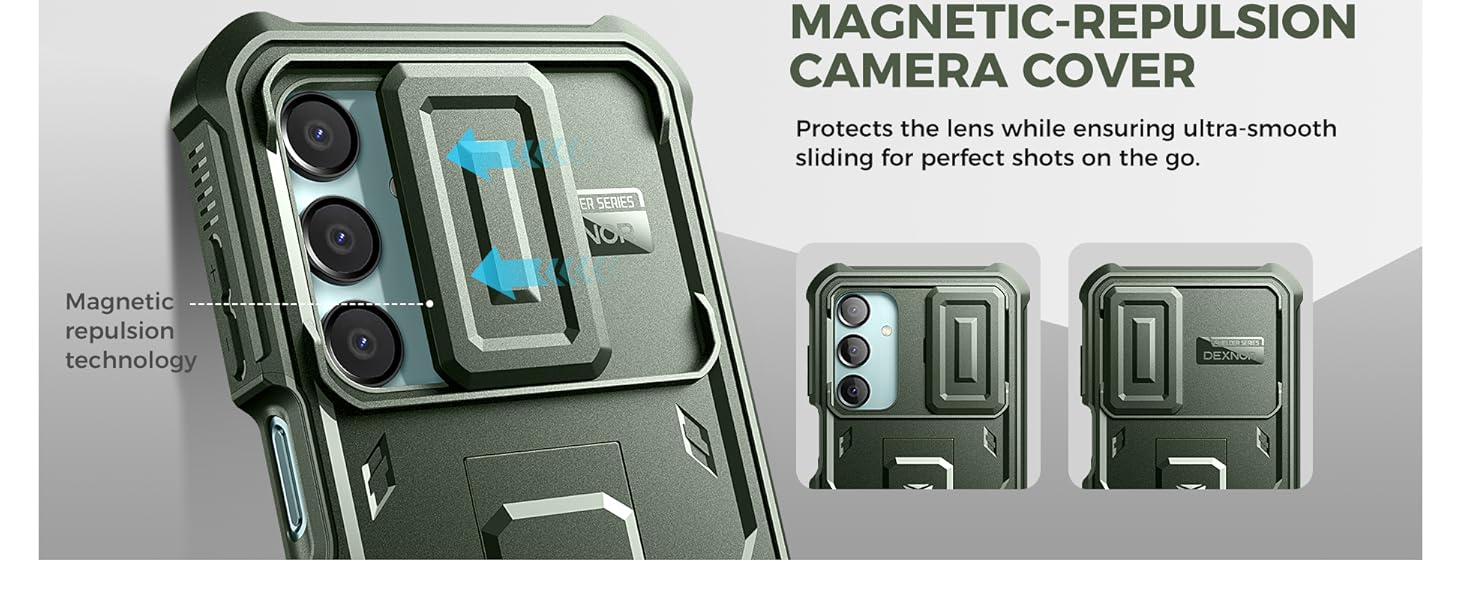 The Dexnor Samsung Galaxy A16-5G case offers military-grade shockproof protection with a dual-layer design, a magnetic sliding camera cover for privacy and lens safety, and two front frame options including a built-in screen protector. It features a foldable kickstand for hands-free viewing and precise cutouts for easy access to all phone functions, making it the ultimate rugged yet sleek companion for your 6.7-inch Galaxy A16-5G.