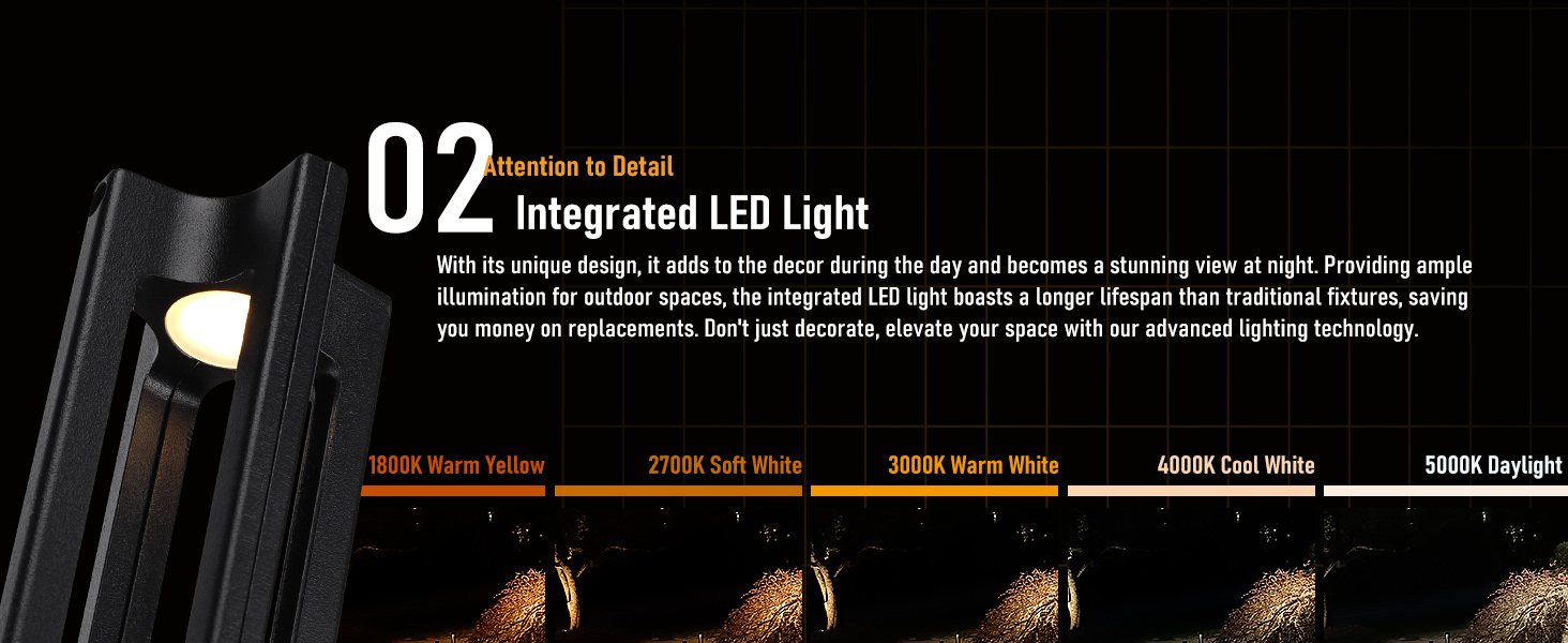 The LEONLITE 5CCT 10-Pack Landscape Pathway Lights offer versatile outdoor lighting with 5 selectable color temperatures (1800K to 5000K) and energy-efficient 3W LEDs delivering 100 lumens each. Crafted from corrosion-resistant aluminum with an IP65 waterproof rating, these ETL-certified fixtures provide durable, safe, and stylish illumination for driveways, gardens, and pathways. Designed for easy low-voltage installation, they promise 30,000 hours of captivating, eye-friendly light to elevate your outdoor ambiance.