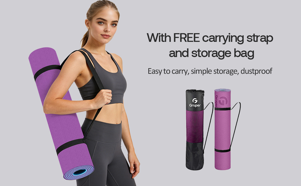 The Gruper Yoga Mat combines eco-friendly thermoplastic elastomers with a double-layer anti-tear design and sticky non-slip texture on both sides. Available in two thicknesses (6mm and 8mm), it offers superior comfort and durability for yoga, Pilates, and floor exercises. Comes with a free carrying strap and storage bag for easy transport, making it the perfect companion for home workouts or studio sessions.