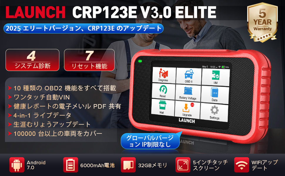 The LAUNCH CRP123X ELITE is a cutting-edge OBD2 diagnostic tool featuring a vibrant 5-inch HD touchscreen, a robust 6100mAh rechargeable battery, and 32GB of memory powered by Android 8.1. It supports multi-system diagnostics across ABS, SRS, AT, and engine systems with 10 OBD2 modes, plus 7 essential reset functions to maintain vehicle efficiency. With global brand compatibility, one-click Wi-Fi lifetime updates, and multilingual support, it’s designed for professional-grade diagnostics and seamless user experience—perfect for millennial car owners who demand precision and convenience.